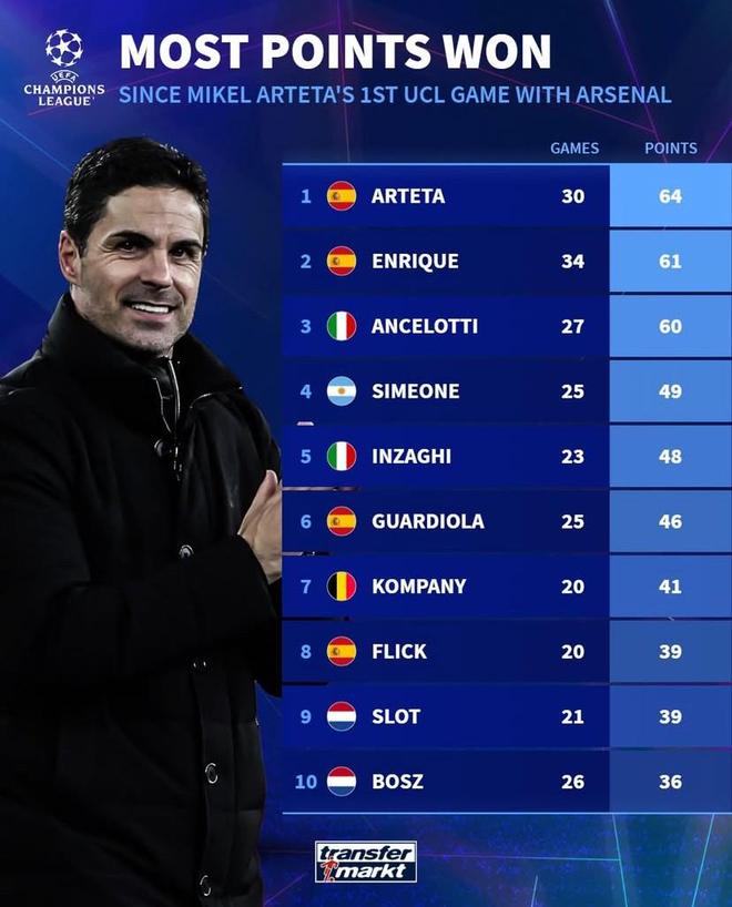 自执教阿森纳欧冠首秀以来,阿尔特塔欧冠拿分所有主帅第一